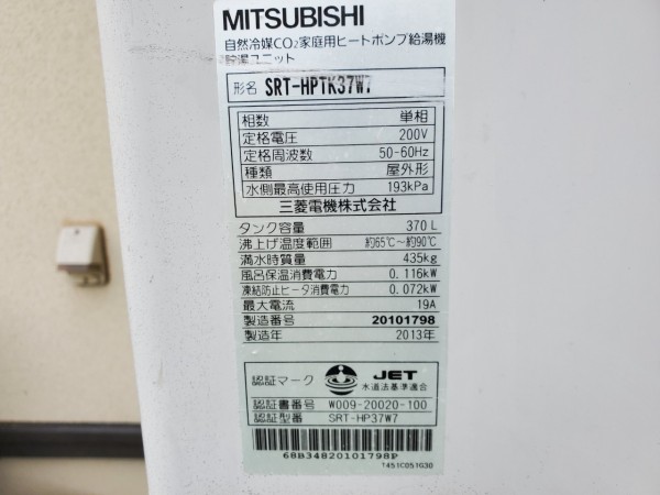 坂出市新浜町 三菱電機エコキュートSRT-HPTK37WT→コロナ自然冷媒CO2家庭用ヒートポンプ給湯機貯湯ユニットCTU-37AY5K エコキュート交換工事
