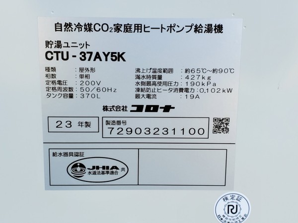 坂出市新浜町 コロナ自然冷媒CO2家庭用ヒートポンプ給湯機貯湯ユニットCTU-37AY5K エコキュート交換工事