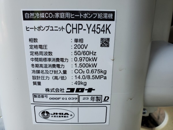琴平町五條 コロナ自然冷媒CO2家庭用ヒートポンプ給湯機 ヒートポンプユニットCHP-Y454K エコキュート交換工事