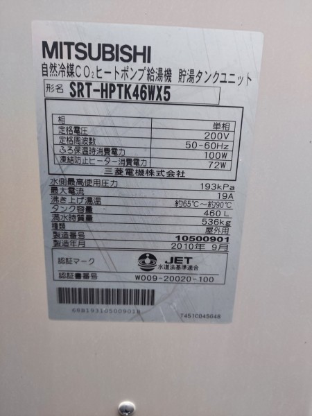 東かがわ市坂元 三菱電機エコキュートSRT-HPTK46WX5→三菱電機家庭用自然冷媒CO2ヒートポンプ給湯機貯湯ユニットSRT-STK376D エコキュート交換工事