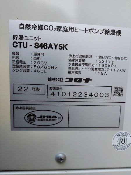 坂出市瀬居町 コロナエコキュート→コロナ自然冷媒CO2家庭用ヒートポンプ給湯機貯湯ユニットCTU-S46AY5K エコキュート交換工事