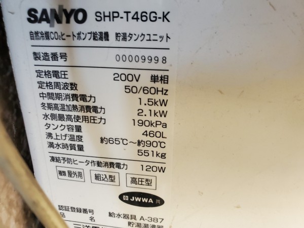 さぬき市長尾東 SANYOエコキュート→コロナ自然冷媒CO2家庭用ヒートポンプ給湯機ヒートポンプユニットCHP-Y454K エコキュート交換工事