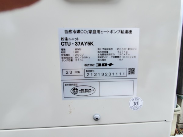 東かがわ市湊 コロナエコキュート→コロナ自然冷媒CO2家庭用ヒートポンプ給湯機給湯機貯湯ユニットCHP-37AY5K エコキュート交換工事