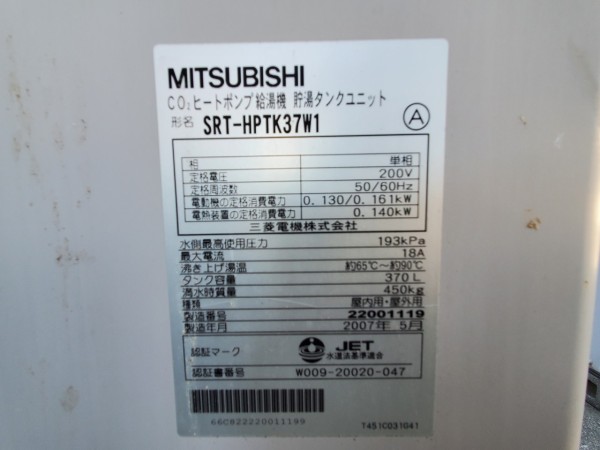 丸亀市今津町 三菱電機エコキュート→三菱電機自然冷媒CO2家庭用ヒートポンプ給湯機貯湯ユニットSRT-STK376D エコキュート交換工事