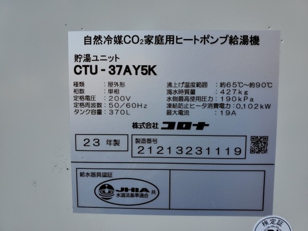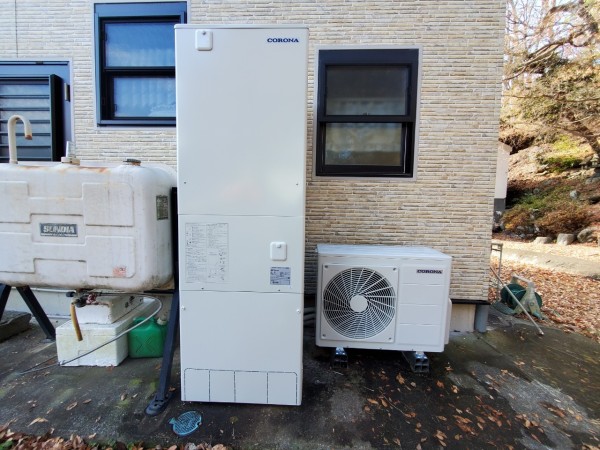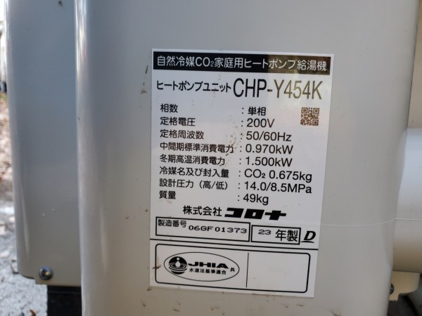 高松市茜町 コロナ自然冷媒CO2家庭用ヒートポンプ給湯機ヒートポンプユニットCHP-Y454K、貯湯ユニットCTU-37AY5K エコキュート交換工事