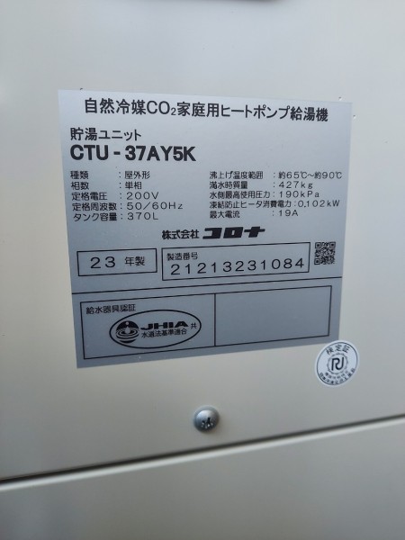 坂出市新浜町 コロナ自然冷媒CO2家庭用ヒートポンプ給湯機貯湯ユニットCTU-37AY5K エコキュート交換工事