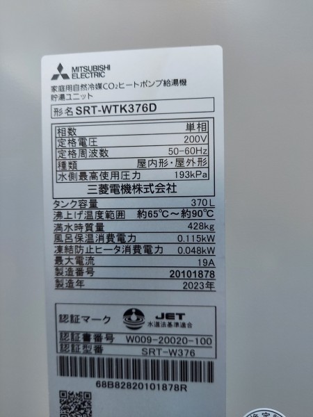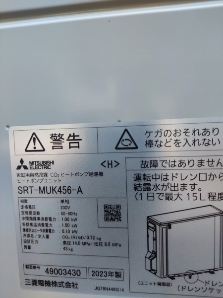 高松市鹿角町 三菱電機自然冷媒CO2家庭用ヒートポンプ給湯機ヒートポンプユニットSRT-MUK456-A、貯湯ユニットSRT-WTK376D エコキュート交換工事