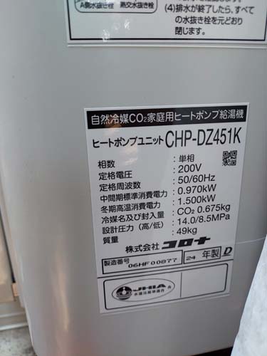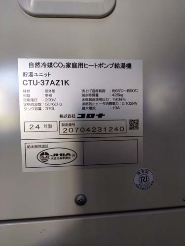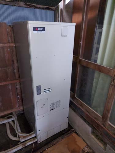 高松市鹿角町 三菱電機エコキュート→コロナ自然冷媒CO2家庭用ヒートポンプ給湯機 貯湯ユニットCTU-37AZ1K、ヒートポンプユニットCHP-DZ451K エコキュート交換工事