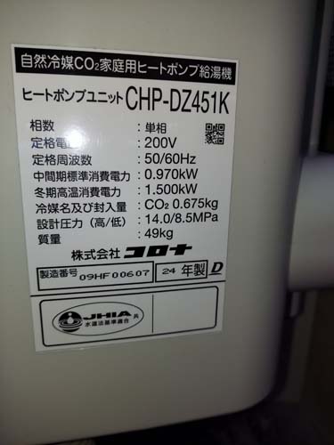 東かがわ市坂元 コロナ自然冷媒CO2家庭用ヒートポンプ給湯機 ヒートポンプユニットCHP-DZ451K エコキュート交換工事