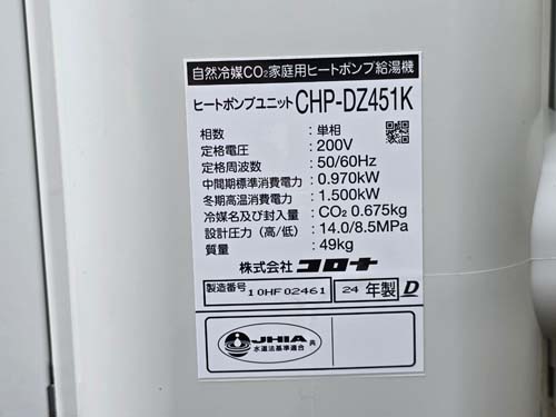 さぬき市志度 コロナエコキュート→コロナ自然冷媒CO2家庭用ヒートポンプ給湯機 ヒートポンプユニットCHP-DZ451K エコキュート交換工事