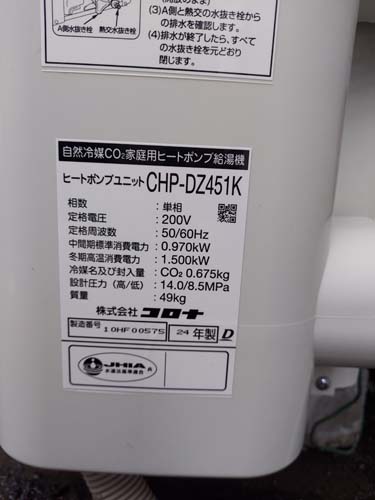 小豆島町二面 コロナ自然冷媒CO2家庭用ヒートポンプ給湯機 ヒートポンプユニットCHP-DZ451K エコキュート交換工事