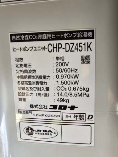 小豆島町坂手 コロナ自然冷媒CO2家庭用ヒートポンプ給湯機 ヒートポンプユニットCHP-DZ451K エコキュート交換工事