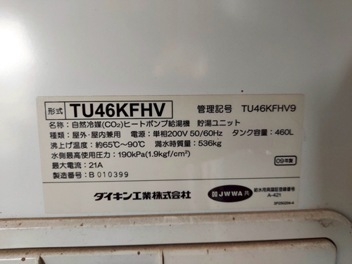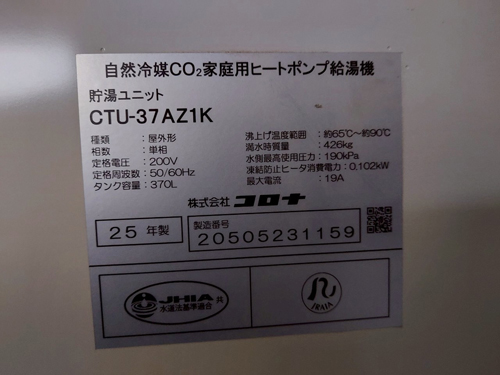 綾川町千疋 ダイキン自然冷媒CO2ヒートポンプ給湯機 貯湯ユニットTU46KFHV→コロナ自然冷媒CO2家庭用ヒートポンプ給湯機貯湯ユニットCTU-37AZ1K、ヒートポンプユニットCHP-DZ451K エコキュート交換工事