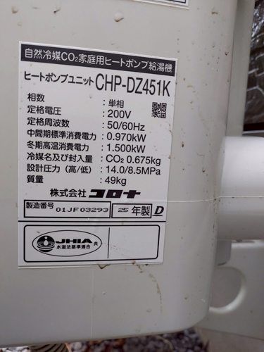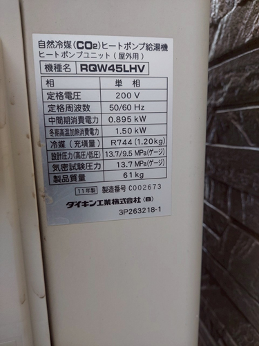 綾川町山田下 ダイキン自然冷媒CO2ヒートポンプ給湯機ヒートポンプユニットRQW45LHV→コロナ自然冷媒CO2家庭用ヒートポンプ給湯機貯湯ユニットCTU-37AZ1K、ヒートポンプユニットCHP-DZ451K エコキュート交換工事