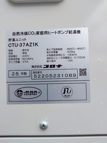 綾川町山田下 コロナ自然冷媒CO2家庭用ヒートポンプ給湯機貯湯ユニットCTU-37AZ1K、ヒートポンプユニットCHP-DZ451K エコキュート交換工事
