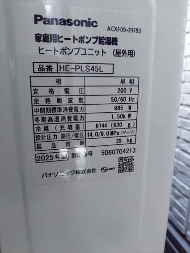 綾川町畑田 パナソニック家庭用ヒートポンプ給湯機 ヒートポンプユニットHE-PLS45L エコキュート交換工事|香川県のエコキュート専門交換工事店|香川エコキュート交換ショップ補助金対応可能