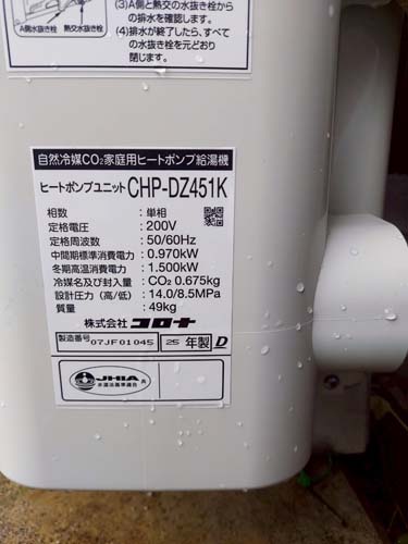 綾川町千疋 コロナ自然冷媒CO2家庭用ヒートポンプ給湯機 ヒートポンプユニットCHP-DZ451K エコキュート交換工事